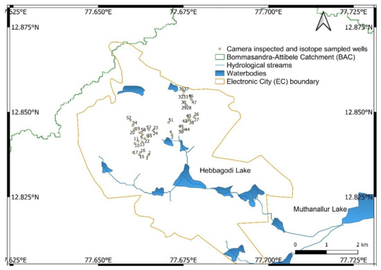 For comparative assessment, we considered Ballukraya and Srinivasan’s [20] theories of identifying wells suitable for long-term monitoring, namely, those with yielding fractures below static water levels. We inspected 54 wells with a camera in the Electronic City (EC) township (Figure 2) [15,35]. Electronic City covers an area of 3.3 km2 and forms an integral part of the rural–urban interface between the municipal and urban district boundary in ridges of the BAC valley. It receives water from a piped supply since 2008, but the borewells which are operational are still being pumped to meet local demands. EC has its own municipality, which is bolstered by bottom-up approaches to long-term water management and strictly enforces the ban on drilling further wells [36,37]. We took note of the well drilling depths, static water levels measured, depth of casing pipes, submersible pumps, yielding and dry fracture depths, and other well obstructions and plotted visualizations of the aquifer structure (Figure A1 in Appendix A; Supplementary Materials S2—Camera Well Logs, Sheet 2). There are four lakes within the sub-catchment, which undergo bed-silt removal, likely leading to increased recharge. The 54 investigated wells are located in a 2.1 km² sub-catchment of the Hebbagodi Lake, which has an industrial land use in the South of Bengaluru, as compared to the northern agricultural sub-catchment of Ballukraya and Srinivasan [20].