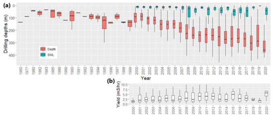 Primary data from well logs collected by local hydrogeological consultants, farmers and borewell drillers were used to determine well depths and water levels on the city scale over time [29,30,31]. Data comprised drilling depth, position (GPS/addresses), date, recorded static water level, and pumping yield. While the collected data may be subject to some uncertainty, its comprehensive nature allows for solid conclusions. Altogether, the dataset comprised 1303 well depths, 640 water levels and 630 borewell yields (Supplementary Materials—Primary Survey Well Depths).