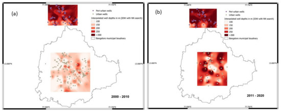 Spatial interpolation through IDW-NN of well depths in meters below ground level (m.bgl) for urban and peri-urban transects of Bengaluru, India, (a) 2000–2010 and (b) 2011–2020.