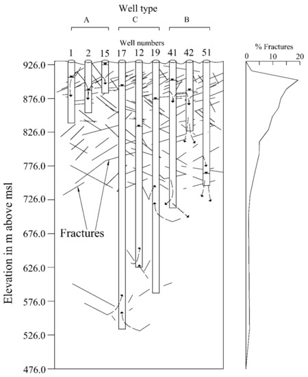 Percentage fractures v/s depth in wells of EC noted through camera inspection. Note that fracture density is highest between 30 and 120 m and drastically reduces at deeper depths.