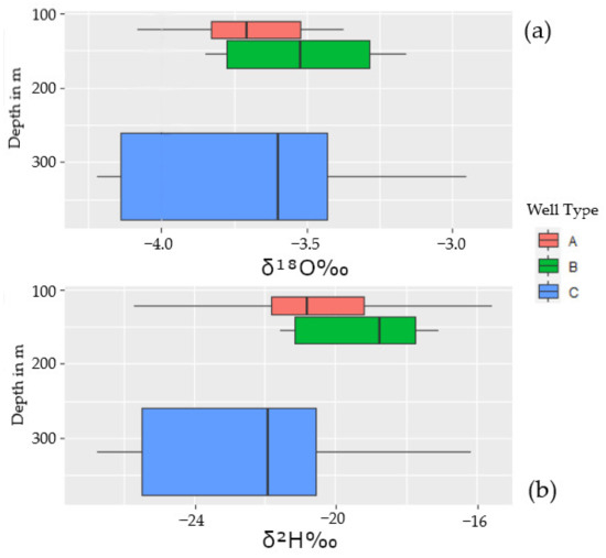 (a) Stable isotope concentration of δ18O‰ samples from borewells in Bengaluru, India, in different depths. Groundwater values do not seem to have a variation across depth. (b) Stable isotope concentration of δ2H‰.
