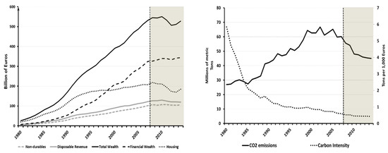 We use annual data for household consumption of nondurables, disposable income, household wealth series, and CO2 emissions from fossil fuel combustion (solid, liquid and gas) and from cement production in Portugal from 1980 to 2014 (see Supplementary Materials). Economic data comes from the Banco de Portugal. All economic variables are measured in millions of euros. In turn, CO2 emissions data comes from the Carbon-Dioxide Information Analysis Centre (see, [30,31]).