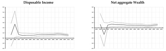 Ultimately, a 1% increase in household financial assets and liabilities wealth causes a much higher increase in household consumption, 0.37%, than that caused by the same stimulus in housing wealth, 0.17%. This result is in line with most of the empirical literature, which suggests that financial wealth and housing wealth have statistically different impacts on household consumption (see, for example, [32,45,46].). However, our result contrasts with that obtained by [33], where the difference between the two effects is much more modest (0.17 and 0.14, respectively for financial and housing wealth).