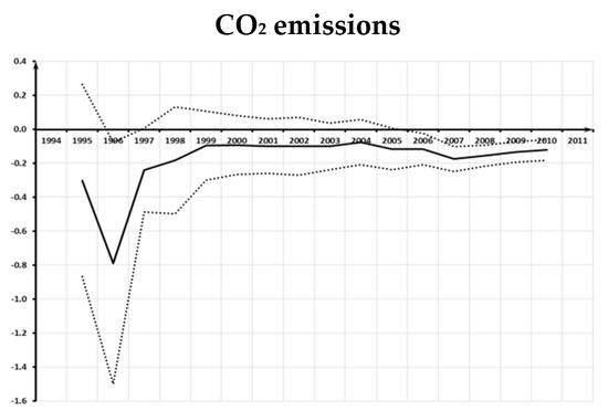 Let us now focus our attention on the coefficient that measures the effect of emissions on household consumption, . For both models, the elasticity of consumption to CO2 emissions is highly significant, negative, and equal to −0.121 and −0.148 for the model with aggregate and disaggregated wealth, respectively. It should also be noted that it was not possible to reject the null hypothesis of equality between the two coefficients for a simple t-test of two independent samples, for a 5% significance level. Therefore, whenever emissions increase (decrease) by 1%, household consumption can be expected to decrease (increase) by 0.121% according to Model 1 or 0.148% according to Model 2.