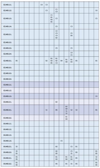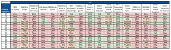 Figure 1 shows a matrix in which each column represents the 15 learning objectives of a specific SDG. The rows correspond to the learning objectives defined by UNESCO according to Cognitive (C1–C5), Socioemotional (S1–S5) and Behavioral (B1–B5) categories. The content of the matrix corresponds to the assignment of each learning objective to the corresponding category: ENG, Any ENG, and Others. A color code has been used to facilitate the reading of the matrix.