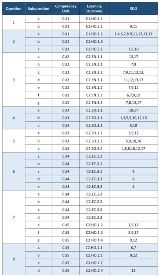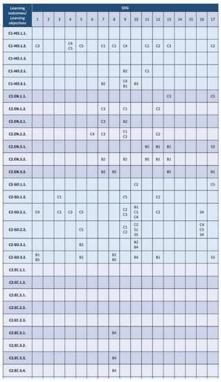 Comparing the learning outcomes of the Engineering Sustainability Map with the SDG-learning objectives [], it can be established that just over a quarter of the SDG-learning objectives are related to all engineering degrees, and two SDG (SDG 2, SDG 14) have no appropriate learning objective to be developed in any engineering degree. To address this issue, the Engineering Sustainability Map includes some learning outcomes that are unrelated to the SDG-learning objectives, but which are related to the SDG. Thus, the Engineering Sustainability Map completes the UNESCO document [] and helps in the achievement of the SDG, including from both the engineering and technology point of view.