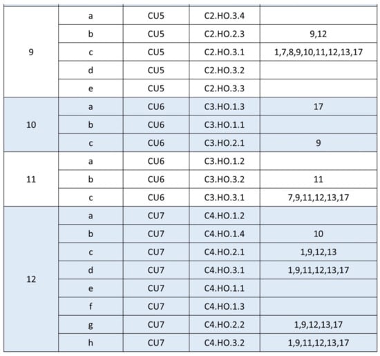 The ESM represents a competency map [], which develops for engineering degrees the sustainability competencies defined by CRUE []. The competency map is essentially a matrix integrating the set of learning outcomes, related to a specific competency, that graduates of a particular curriculum should have acquired at the end of their studies. In this map, the learning outcomes are classified using a learning taxonomy, represented in the columns of the matrix, while the rows of the matrix include the different competency units. Consequently, each cell of the matrix corresponds to a competency unit related to a specific level of the learning taxonomy and consists of one or more learning outcomes.