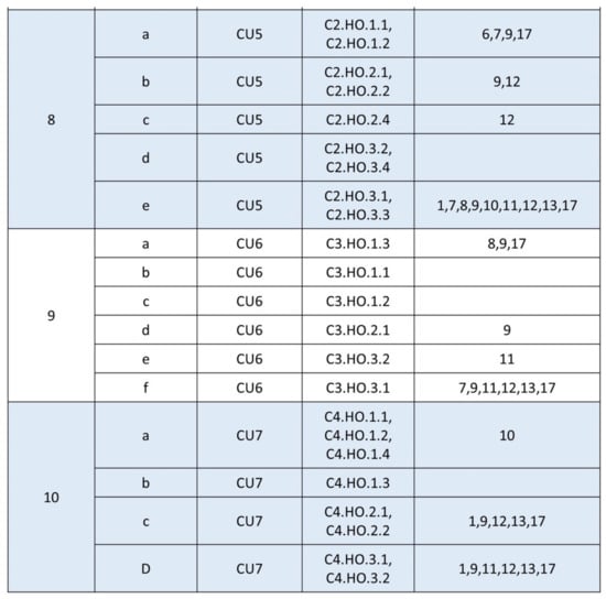 - For the learning objectives belonging to cases (1) and (2), the learning outcomes of the ESM were rewritten so that the relationship between both was more direct. For the objectives belonging to case (3), one or more new learning outcomes were introduced in the map. When necessary, the corresponding learning outcome was rewritten. Nonetheless, the ESM presents some learning outcomes that are not related to any objective learning SDG, although they are related to some SDG. The process was carried out in two iterations: in the first iteration, a pre-allocation between SDG-Learning Objectives and learning outcomes was carried out and the allocation criteria were set; in a second iteration, the results of the first iteration were reviewed, and the learning outcomes were rewritten.