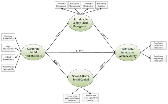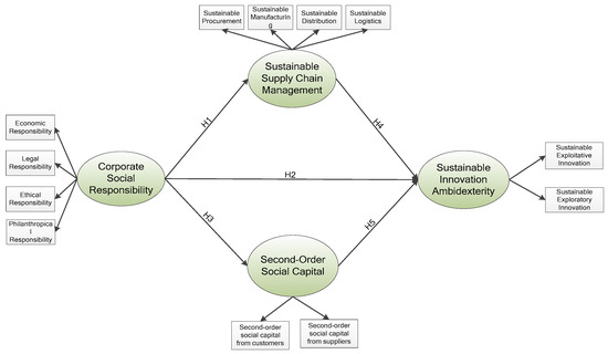 According to Durlauf and Fafchamps, SC is described as a collection of network-centered practices, developed upon general trust, which affect the capability of a country’s citizens to communicate, collaborate, and organize actions [91]. Briefly, SC comprises general trust and its associations. It enables collaboration and knowledge sharing among economic representatives, consequently being essential for innovation initiatives. Innovation is the primary engine of development for several growing economies. While the innovation economy strengthens, SC increases endogenously with the development of monopolistic competitors’ production and profits. Mutual SC develops spontaneously and affects economic development across the innovation segment. In agreement with the observed studies, it is found that economic development improves with the proportion of output, from employees to innovators [29]. Hence, it can be inferred that second-order social capital has a mediating effect on the relationship between CSR and sustainable innovation ambidexterity. The following hypothesis can be postulated: