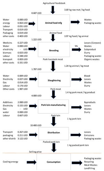 - Pork meat product manufacturing. Including slaughtering, product manufacturing, and distribution. It needs 1.24 kg of alive animal per kg of meat. The input is 1.8 $ of alive meat per kg of produced meat. Other inputs at slaughtering account for 0.75 $ per kg of meat. Pork loin manufacturing involves the use of 1.4 kg of pork meat, pork loin quality, per kg of loin product. Inputs at manufacturing and distribution amount to 4 $ of pork meat and 6.42 $ of other costs.