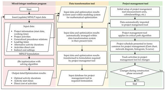 This study fills a knowledge gap on MINLP combined with PMT to support sustainable cost-optimal construction scheduling. The major challenges here are to integrate two different software, i.e., PMT and MINLP, and overcome data incompatibility. Moreover, the created MINLP should generally be applicable to scheduling problems of various sizes, and the changes should be adopted without excessive manual programing. The approach proposed in this paper extends the one previously presented by Klanšek [22] to automatize data flow between MINLP and PMT. An export utility is introduced to store results in a database as an added value to the existing model. A data transformation tool (DTT) was developed to display results in PMT automatically.