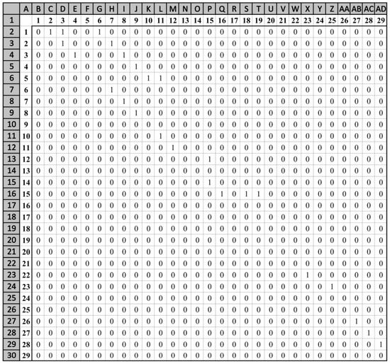 It can be noted that the table contains all the project activities along with their optimal start times, durations, and calculated direct costs. Additionally, indirect costs were included due to the LoE activity. The input parameters for activity successors were exported into individual sheets for each project relationship type and lag/lead time value. The example of the dependency matrix for the Finish-to-Start (FS) relationship exported from the MINLP can be seen in Figure 3. The matrix consists of preceding activities in rows and succeeding activities in columns. The value 0/1 defines the existence of succeeding activities for each task. For example, task “1” is followed by activities “2”, “3”, and “6”.