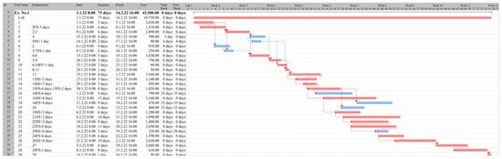 The first application example aims to use the proposed optimization system on project scheduling problems from literature and demonstrate its ability to obtain the exact cost-optimal discrete solution and refine the output data for visual presentation within MS Project. The MINLP presented in reference [24] was upgraded to export the results to a specially developed DTT spreadsheet. The objective of the MINLP optimization was to find the optimal discrete schedule for a construction project under the minimum total project cost, subject to generalized precedence relationship constraints, restrictions for overall project duration, and logical conditions on start times and durations of activities.