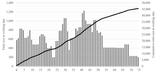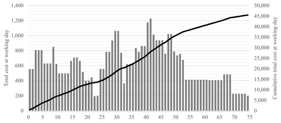 The data in Table 2 can be considered as input data for MS Project. At this point, MS Project file was linked to the data within DTT table. The resulting Gantt chart in MS Project can be seen in Figure 4. The Project summary task shows that optimization of the example project schedule gained the minimum total project cost of 45,500 cost units and an optimal project duration of 75 days. The MS Project shows the generalized precedence relations between activities. As a result, a critical path can be identified for a cost-optimal project schedule. The optimal results can also be represented with an appropriate network diagram (Figure 5). The network diagram displays the workflow of project activities with additional information on activity early start, late start, early finish, late finish, as well as total and free floats. The MS Project can be used at this point for project management to track the execution of individual activities and even generate visual reports. An example of a visual project report is shown in Figure 6. The graph represents the minimum total costs in the form of a histogram and S-curve.