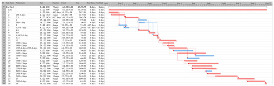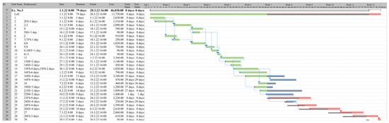 This example is aimed to demonstrate the usability of the proposed system in a volatile construction environment. Since unexpected influential events during the project implementation are not that uncommon, the system may have to be updated during the construction period, and schedules should be re-optimized to minimize additional expenses. As a baseline for the initial construction schedule, we have chosen the solution from Section 4.2. For example, during the construction phase, it was found that activity “23” will start one day later than initially scheduled. Besides that, the task duration will be extended from 11 days to 14 days due to workforce shortage. Since activity “23” was on a critical path, the project duration would inevitably be prolonged. The changes to the initial settings were entered by fixing start times and durations for activity “23” and its predecessors. After the re-optimization, the resulting schedule was presented in MS Project, and the schedule changes can be seen in Figure 10.