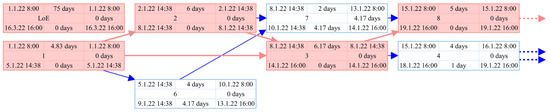 The activity start times were changed to dates by adding an initial numerical value to the project start date determined in execute section. For example, the calculated start time of activity “8” in Table 1 was 15. Hence, the number 15 was subtracted by one and added to the project start date “1 January 2022” to result in “15 January 2022”. Suppose the resulting start time was calculated as a non-integer value, such as activity “2” in Table 3. In that case, a record is created with the exact time when the specified activity begins during the working day. For instance, activity “2” has obtained a value of 2.83 after the optimization process, so number two defines that the task starts on “2 January 2022”. The remainder of 0.83 describes that the activity begins at “14:38:24” that day if initial project settings are as in Listing 1.