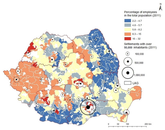 The spatial distribution of the percentage of employees (employed, including employers) from the LAGs’ total population indicates a territorial diversity in terms of the level of development at the beginning of LEADER financing in Romania (2011), a diversity that characterised at that time the Romanian countryside. The east–west contrast is obvious, with most underdeveloped LAGs located outside of the Carpathian arc, while the higher-developed LAGs are concentrated in the western part (see Figure 3). In addition, a second core of less-developed LAGs was concentrated in 2011 to the southern part of the country. The position of LAGs towards the urban centres with over 50,000 inhabitants explains in many cases the associations’ level of development [46,47]. The proximity to urban settlements has brought to the metropolitan area’s communes a series of advantages that contribute to the increase in the general level of development of the LAG to which they belong [46,47]. The amplitude of the values was a significant one with a difference of 21% between the most developed association (LAG Cociovaliștea Ilfov Nord Vest) and the least developed association (LAG Pădurile Dacice, Vrancea) at a national level. The division into classes illustrates five typologies of LAGs with different levels of development, most of the associations being characterised by a very low (type I—27.6%) and medium development level (type III—29.2%). Thus, over 50% of the territorial associations had, at the time of their establishment, a lower level of development than the national average, while only 24.6% of them had a high and very high level of development. This indicates a high favourability of the Romanian rural territory for the implementation of the LEADER program, especially in the northeastern and southwestern parts of the country, where most of the underdeveloped LAGs were concentrated. Overall, the low values of this indicator are mainly explained by the large number of inhabitants that work without a legal form (thus, not being included in the official statistics), the high volume of retirees, the people living on social assistance funds and also the massive emigration to Western countries [48]. In this case, most of the emigrants continue to be officially counted as residents (because they choose not to declare the change of residency), even if, in reality, they are not present in the communes because they are living and working abroad.