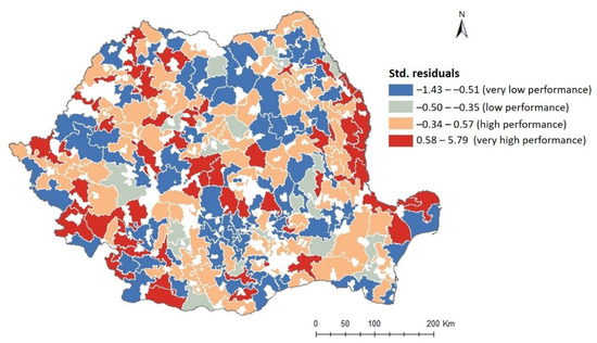 Thus, LAGs with a much lower performance than estimated in absorbing LEADER funds can be identified both in the eastern part of the country, where disadvantaged rural communities predominate, and in the centre and west, regions characterised by a higher level of development (see Figure 14). The same situation is encountered in the case of LAGs with a performance much higher than the values estimated in the absorption of LEADER funds, these being encountered in both the east and the west, contrasting regions in terms of the level of development. LAGs with predominantly positive residual values outnumber those with predominantly negative residual values. Thus, in 59.4% of the associations, the performance in absorbing LEADER funds was above expectations, and in 40.6% of cases, the performance was below the expected level.