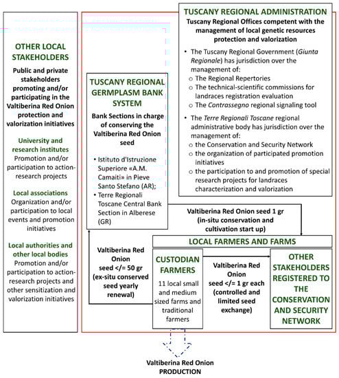 Interviewed Regional Officers evidenced how local farmers activated to characterize the landrace to both counteract the risk of extinction and actualize local genetic resource production and market potential. Once registered, based on the L.R. 64/2004 provisions Valtiberina Red Onion seed was selected and entrusted to the Conservation and Security Network for breeding and reproduction (Figure 2) []. As members of the publicly funded and controlled network within the geographical boundaries of the landrace registered typical production area (Section 4.1), both the Central and the Valtiberina Regional Germplasm Bank sections, together with eleven local farmers (so-called custodian farmers), took action for conservation of the Valtiberina Red Onion.