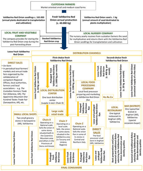 Furthermore, interviews evidenced the important collaboration between the group of producer custodians and a local food processor in the creation of Valtiberina Red Onion flan, marketed both directly in stores and indirectly by regularly supplying a national large retailer (Figure 3). The interviewed processor affirmed that he successfully promotes the Valtiberina Red Onion registered denomination as an identity quality attribute for product differentiation, thus obtaining an increase in product placement and sales volume, selling price, and final consumer value.