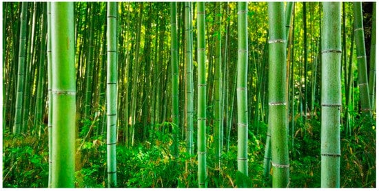Despite the current state-of-the-art research and development demonstrating the enormous inroads made to date on the valorization of lignocellulosic biomass into sustainable chemicals and materials, [44,78,79,80,81,82,83] emerging literature asserts that we have barely scratched the surface with respect to the vast application portfolios, technologies, and chemical processes, and in the understanding of the fundamental theories presented by lignocellulosic biomass valorization [72,73]. For example, the World Economic Forum noted that biobased lignin feedstock ranks amongst the top emerging technologies of the future, as it will play a significant role in the pursuits for energy security and a circular economy [74]. Moreover, the exigencies concerning our materials needs, energy, and fuel security, and the pursuit for a circular economy, whereby we are able to meet our current demands without jeopardizing those of future generations, has necessitated the need to sustain these lignocellulosic biomass supplies to meet existing and emerging global demands. One way to achieve this is to harness the vast opportunities presented by perennial plants such as the bamboos (see Figure 2), with certain species sharing the world record as the fastest-growing plants on earth; these species grow at an average of 2.92 feet per day, which translates to a rate of 0.83 × 10−5 m/s [75].