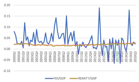 Foreign remittances are an important component of further economic development for many countries. Compared to FDI, foreign remittances are also much more stable flows. Throughout the global financial crisis in 2008, foreign remittances experienced a minimal decline relative to FDI. In addition, remittances have shown greater resilience during the COVID-19 crisis of 2020–2021; their expected decline is approximately 20% [10]. In comparison, according to [11], FDI is expected to fall by 40%, while greenfield FDI will fall by 50%. According to [12], foreign remittances can also play a significant role in achieving Sustainable Development Goals.