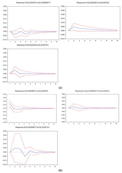 Figure 4b depicts the impulse response functions for a one-unit change in gdp, fdi, and gfcf on the dynamic reaction of remittances. While there appears to be a slight increase in remittances in the quarter following a shock to gdp, the impact is short-lived and is economically and statistically insignificant after the first quarter after the shock. Remittances respond in a manner that is not statistically or economically significant to unit shocks to fdi or gfcf.