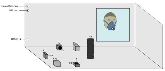 2 chamber setup for measurement of respiratory particles and CO2. OPS: Optical Particle Sizer, F1–F3: mixing fans, T: temperature probe, RH: relative humidity probe, CO2: infrared CO2 sensor, AB: AirBubbl.