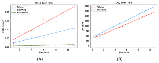 Typical experimental data for one of the fifteen participants. (A): Increase in respiratory aerosols over time in a 2 chamber from background leakage, a breathing and a talking experiment. (B): Typical increase in CO2 over time during the same breathing and talking experiments.