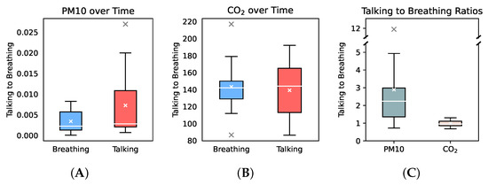 Boxplots of production rates and ratios from 15 participants. The median and mean are represented by a white line and a white cross, respectively, while the lower and upper box limits correspond to the lower and upper quartiles. Outliers are shown for data points exceeding the upper quartile plus 1.5 times the interquartile range (IQR) and data points lower than the lower quartile minus 1.5 times the IQR. (A): Increase in respiratory aerosols over time from respective breathing and talking experiments of 15 participants in a 2 chamber. (B): CO2 production rates of 15 participants during the respective experiments. (C): Ratios of production rates from talking compared to breathing for each subject. Notice the break on the y scale, which was used to include an outlier.