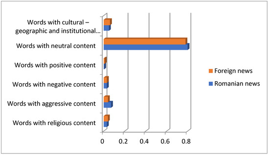 The comparative analysis (Figure 1), reveals that Romanian and foreign news has the same amount of negative emotional load (M = 0.03). With regard to words with religious content, they are used by Romanian mass-media channels (M = 0.04) and foreign mass-media channels (0.03), almost with the same amount. With regard to words with aggressive content, contrary to our expectations, they are used more in Romanian news (M = 0.07) than in foreign news (M = 0.04), and implicitly, words with positive content are fewer in Romanian news (0.005) than in foreign news (0.01). Moreover, in Romanian news words with neutral content (M = 0.78) are used almost in the same amount as they are used in foreign news (M = 0.80).