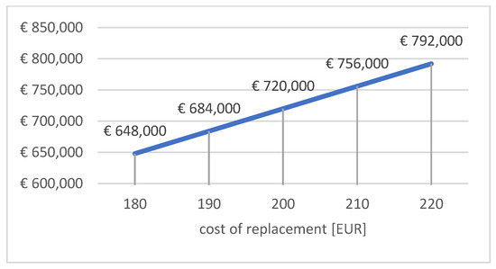 The presented results of the sensitivity analysis show that the influence of all variables is linear. The variable N has the greatest impact. Increasing it by one cycle causes an increase in the value of the cost of living by about 25%. A change in the number of units of a product by 100 affects the end results as much as a change in the cost of replacing a unit by 10 EUR, which equals 5%. The adopted warranty period has the least impact. Extending the warranty period by 1 year reduces costs by less than 4%.