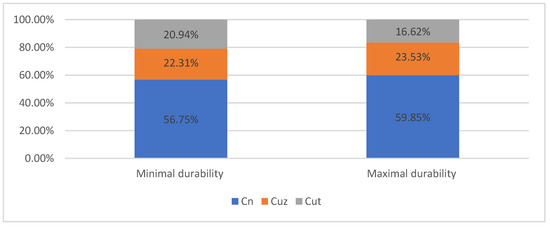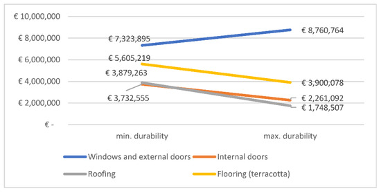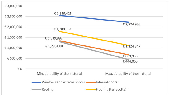 Other elements, i.e., internal doors, roof and floors, remain the cheapest in the case of choosing the most durable solutions and the most expensive in the case of choosing the least durable.