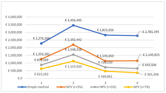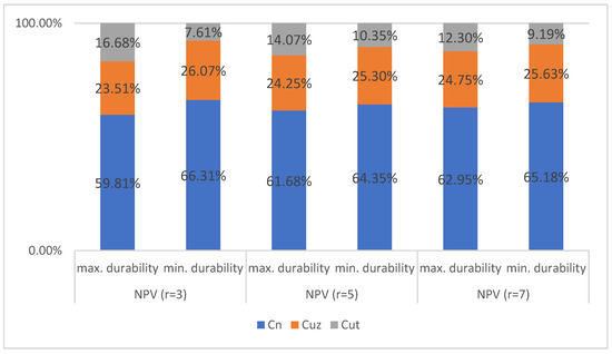 Figure 5 shows the costs of maintaining the presented element for four solutions. The cheapest maintenance costs were obtained for the most durable solution, and thus the most expensive; however, the least durable solution did not turn out in this case, the most expensive solution from the maintaining cost point of view an element throughout the entire computing period of the building. It turned out that medium-lasting solutions are the least cost-effective, presumably due to the fact that they are more expensive than the least-durable variant, and at the same time, the number of product use cycles during the calculation period is not sufficiently reduced to comply with higher purchase costs.