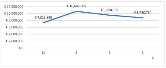 It must be noted that the analyses took into account only selected elements of the building that the contracting authority may take into account in the analysis of the maintenance costs. It is practically impossible to determine the total maintenance costs in accordance with the ordinance. As was already mentioned, the formula provided in the regulation takes into account only the cost of replacing building elements without taking into account the costs of their ongoing maintenance. For this reason, following the regulation, it is difficult to determine the maintenance costs of elements, such as pumps, elevators, HVAC equipment, escalators, lamps or water and fire devices. The assumption adopted in the regulation allows, for instance, for the inclusion of the maintenance costs of elevators, but only in the case of their replacement 1–3 times. In practice, such actions do not take place with a building’s 30-year life cycle.