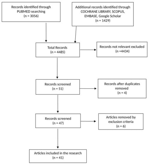 The online search yielded 4485 studies: PubMed (3056), Scopus (21), Cochrane Library (13), Embase (115), Google Scholar (1280). Of these, 4434 studies were excluded because they were deemed unrelated to noise-related problems. Among the remaining studies, four articles were also excluded because they were duplicates. Duplicate publications were carefully eliminated in order not to introduce bias, by comparing the names of the authors, the topics addressed, the workers examined, and the results obtained. Another six publications were deleted because the full text was not available. In conclusion, 41 studies were finally included in this analysis (Figure 1). Of these, 4 are literature reviews (2 systematic; 2 narrative) and 37 are original articles. Among the latter, 16 are cross-sectional studies, 2 cohort studies, 5 case control studies, 2 pilot studies, 1 observational study, 10 experimental studies, and 1 mixed (cross / experimental) study (Table 2).