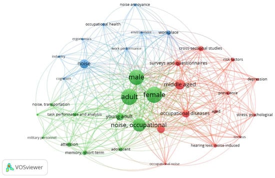 We used the VosViewer tool to create a bibliographic map of the articles retrieved [33]. Figure 2 shows the keywords’ co-occurrence network of the articles in the sample. Node sizes are proportional to how many articles are labeled with the keyword selected. Two nodes are connected if the respective keywords are co-associated in an article. The restriction to generate the network is that each keyword occurs almost three times; 36 terms were identified and the total strength of the co-occurrence links with other keywords were calculated. The term “human” was excluded from the network map because all the studies considered have humans as subjects. The network map shows three clusters of keywords’ co-occurrence. The major disturbances linked to noise are “depression,” “psychological stress,” “hearing loss,” which are associated with “occupational disease” and have a link to the keyword “middle aged.” The cluster shows keywords such as “cross-sectional studies,” “prevalence,” and “risk factors,” suggesting the type of prevalent studies in the selected articles. Moreover, “surveys and questionnaires” seems to be the most used tools in the investigations (cluster red on the right side). “Attention,” “short-term memory,” and “task performance” are the other keywords shown on the map and linked to “occupational noise” and “transportation noise” (cluster green on the left). Cluster blue on the top groups’ keywords related to work environment makes a connection between ergonomics, noise, and work performance.