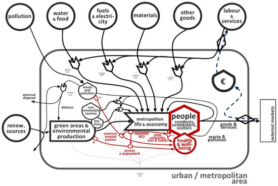 - A first-of-its-kind systems diagram is drawn, based on the energy systems language, presenting and highlighting some systemic connections between urban life and economy, socioeconomic determinants, and natural environment and green areas on the one side and urban health on the other.