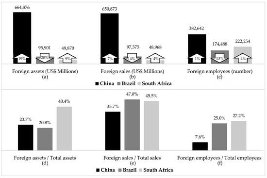 As disclosed in Figure 2b,c, the inclination witnessed in the growth of foreign assets is similarly revealed when examining foreign sales and foreign employees. In this regard, the foreign proceeds and employment of the leading Chinese NFEMNEs expanded by 7% and 1%, while that of the South African NFEMNEs individually expanded by 4%. In contrast, the foreign sales and employment of the top 20 Brazilian NFEMNEs declined by 14% and 13%, respectively, in 2015.