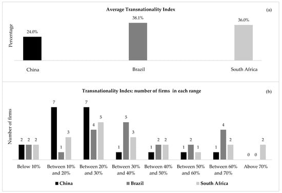 The transnationality index (TNI) is computed as the average of the following three ratios: foreign-assets to total-assets, foreign-employment to total-employment and foreign-sales to total-sales. It is expressed as a percentage. The theoretical framework underlying the TNI assists in assessing the extent to which the undertakings and interests of enterprises are entrenched in their respective home country or host countries []. The average TNI of the top 20 NFEMNEs is arithmetically calculated as the average of their discrete transnationality indices. As revealed in Figure 4a, the average TNI of the top 20 Brazilian NFEMNEs was the largest amongst the three countries (38.1%), followed by the average of the South African NFEMNEs (36.0%) and by the average of the Chinese NFEMNEs (24.0%). The TNI of the Chinese NFEMNEs in 2015 was prejudiced by the inferior foreign-employee ratio.