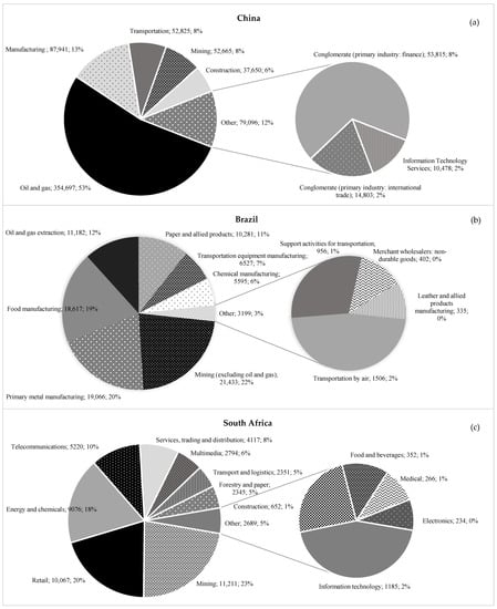 The oil and gas extraction sector dominated the foreign assets of the top 20 Chinese NFEMNEs, accounting for 53% of the total foreign assets. As shown in Figure 5a, in contrast to the top 20 Brazilian and South African NFEMNEs, the mining industry (8%) accounts for a smaller proportion of the top 20 Chinese NFEMNEs’ foreign assets. Nonetheless, as in the case of Brazil, the manufacturing industry (13%) also meaningfully accounts for the Chinese NFEMNEs’ foreign assets, besides the extractive industries.