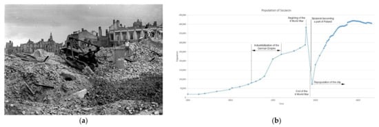The civilian air defence played a key role in the history of the city, and as a cultural heritage resource it should be revitalised in a way that makes its historical character recognisable and ensures the contemporary restoration of the social value of the spaces found [16]. (a) Cityscape of the outer bailey after the carpet bombing of the allied forces; (b) the period of the collapse of the population of Szczecin during the air raids at the end of the Second World War [5,8].