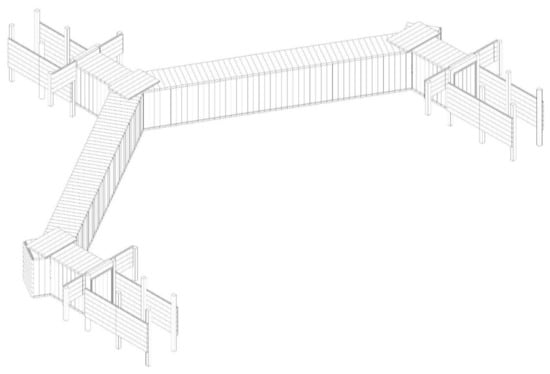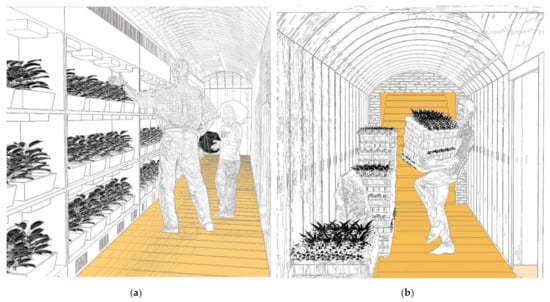 The four main corridors will be equipped with 24 modules. Each of the corridors will be equipped with closets for the production of different sizes of crops. The eastern corridor will additionally host storages, shelves, tanks, and the module responsible for weighting, packing, and paying. Two short tunnels followed by the exits will remain empty, functioning as transitional space between the outside and the production area. The main door will be located between the first and second corridor, shifting the entrance threshold inside the structure; it reduces the pressure of involvement and gives room for the development of social interactions. The entrance pavilions are kept in perfect condition, and they allow for the use of the first option from a designed algorithm, using two elements that will secure the stair area. Throughout the whole length of the shelter a single material path will be laid that will extend far beyond the shelter until it intersects with a pedestrian path to strengthen its presence in the urban environment, which in the future can serve as a strong brand-building base (Figure 12).