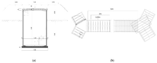 The cardinal principle of the project is to divide the corridor into spatially identical fragments, which will be able to join to form longer structures, just as in the original tunnel construction scheme. Each fragment will be 2 m long, which corresponds to the length of eight prefabricated structural elements and ⅙ of the length of a standard 12 m corridor, and will be the basis for the design of a standardised module to accommodate all the shelters (Figure 7). This module will then be divided into two parts: a 30-cm-deep production space and a 75-cm-deep routing space. This division was based on the minimum space required for the storage of pre-assembled hydroponic systems available on the private market and the minimum space specified in Polish health and safety regulations for one-way access to the equipment in facilities intended for production.