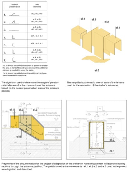 As with the design for the tunnels, the design of the entrance aimed to be as flexible and adaptive. The design consists of five elements that can be used depending on the type and degree of preservation of the structure. It takes the form of a modest addition that follows the shape of the original design. The new structure was deprived of its thickness and massiveness in order to create contrast and highlight the features of the existing structure. All the elements are placed inside, providing support without integration into the structure, to easily determine which parts should be used when an algorithm featuring a different scenario was created (Figure 9). It is worth noting that the system was created to secure the entrances in the cheapest and least aggressive way possible, and can be adapted or extended to allow more accessibility. Regardless of the situation however, each adaptation will add to the coherent presence of the adapted shelter system in the city tissue.