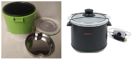 Low-intensity cooking technologies considered. (Left) rice cooker consisting of a main container for rice; a superior plate for vegetables, fish, or meat; and a sealed lid. (Right) slow cooker consisting of a main container and a lid.