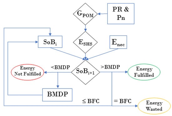 The electricity demand is covered if , otherwise the SHS cannot supply the electricity required, and the corresponding day is flagged as “battery empty.” If , there is an energy excess that cannot be stored, and the corresponding day is flagged as “battery full.”