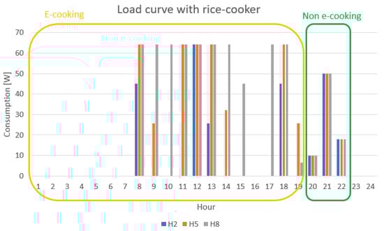 Figure 4 depicts the non-cooking consumption curve and e-cooking operational windows. Since the cooking capacity was limited by the cooking device size, it was assumed using it consecutively, while loading and unloading the cooking device as many times as required to cover the household necessities. Thus, this figure depicts in which manner the different scenarios (H2, H5, and H8) impacted the SHS load curve.