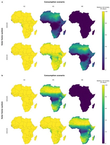 The high energy requirements of a house of eight people (H8) were never covered with the SHS100 without reaching the . Indeed, the battery was empty every day at any African location. Despite this, the SHS100 was able to supply around 40–80% of the daily electricity requirements (Figure A1). When considering the larger SHS150, the days with the battery not empty increased to 40–80% in regions with 2600 kWh/m, and the electricity demand coverage increased as well up to a 60–100%, making the SHS150 a viable solution for the H8 scenario in African regions with high solar resources.