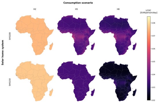 Figure 7 shows that PV size does not influence LCOC for H2, valued at EUR 0.08/person/day. Despite the fact that H5 and H8 coverage was lower than that for H2—indeed not all the household necessities were covered and was frequently reached as seen in Section 3—the energy exploitation was higher, leading to a remarkable LCOC reduction, with values ranging from EUR 0.04/person/day for SHS100 to EUR 0.02/person/day for H8 with SHS150. The LCOC values of H5 and H8 were equivalent to the low range of cooking with wood and charcoal of EUR 0.02/person/day. However, while the coverage with wood and charcoal depends on the availability of the fuel, achieving such LCOC values with high coverage and high battery performance is limited to regions with 2600 kWh/m for H5 with SHS150, and regions with 2700 kWh/m for H8 with SHS150. In other regions, e-cooking should be coupled with other cooking technologies to fully supply all household necessities.